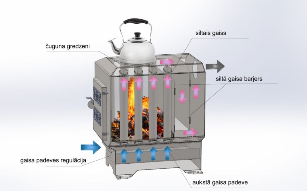 Long-burning furnace with steel door B2. The effect of prolonged burning is achieved due to two plates located in the back of the furnace, which prevent the direct tongue of flame. The furnace provides convective pipes that quickly and easily heat the air in the room. The work of convective pipes is that cold air is sucked in from below and passing through the pipes that go through the furnace, heats up and comes out from above.
